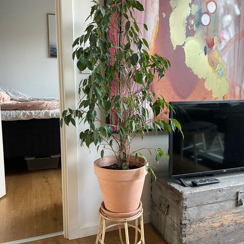 Stueplante i potte med rullebræt. Planten har nåleformede, grønne blade og en opret vækstform. Den står i en rund potte med underskål, som er monteret på hjul, så den er let at flytte rundt. Velegnet som indendørs grøn plante i stue eller andre opholdsrum.