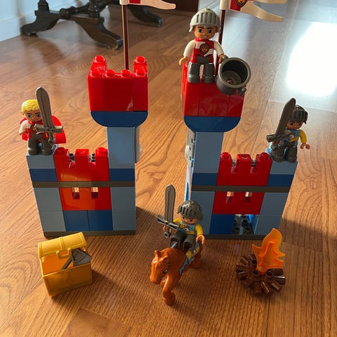 Super fin ridder Bog fra Lego. Sættet er fra 2004. Der medfølger en kanon to heste to røde- og to blå ridder.