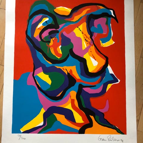 Her får man et meget fint grafisk tryk, af den danske kunstner - Gorm Eriksen som måler 100 x 70 cm. Trykket kommer fastgjort på tynd træplade, uden ramme og har et lille rids midt på, som vist på billedet.