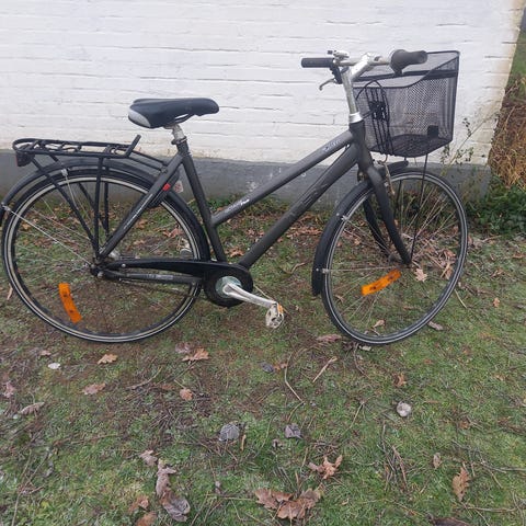 MBK damecykel sort i størrelse L med 28" hjul. Cyklen har lav indstigning og er velegnet til kvinder. Udstyret med fastmonteret forkurv, bagagebærer, støtteben og skærme. Styr med håndbremser og komfortsadel. Farven fremstår som sort. Egnet til daglig transport og bykørsel.