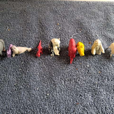 Blandet sæt med 8 dele: 6 små figurer (ridder, 2 grønne leoparder, krokodille, gul puddelhund og rød dinosaur) samt en lille gul kurv og en ring. Sælges samlet.