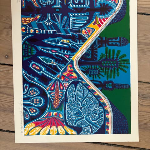 Abstrakt maleri i stærke, kontrastfulde farver med organiske og geometriske former. Værket er indrammet i en lys ramme med passepartout, som fremhæver billedets farver og komposition. Egnet som vægudsmykning i stue, kontor eller andre opholdsrum, hvor der ønskes et markant, farverigt udtryk.