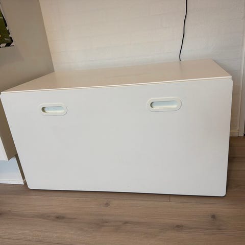 IKEA legetøjskasse i hvid. Kassen har låg og udtræk med integrerede håndtag i fronten. Egnet til opbevaring af legetøj, tøj eller andre børnesager på børneværelset. Overfladen er glat og kan tørres af med en fugtig klud. Kan placeres op ad væg eller under en reol for ekstra opbevaringsplads.