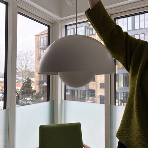 AI tekst: &tradition Verner Panton pendel i grå farve. Lampen har en klokkeformet skærm og ophæng med hvid ledning. Velegnet som loftlampe over bord eller i mindre rum. Designet af Verner Panton for &tradition.