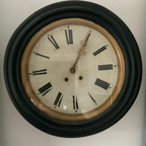 Rundt vægur med ramme i sort og urskive i beige/naturfarver. Uret har store romertal og to visere til time og minut. Designet er inspireret af klassiske station- eller retro-ure og egner sig til ophæng i stue, køkken, kontor eller gang. Drives sandsynligvis af batteri (ikke synligt på billedet).