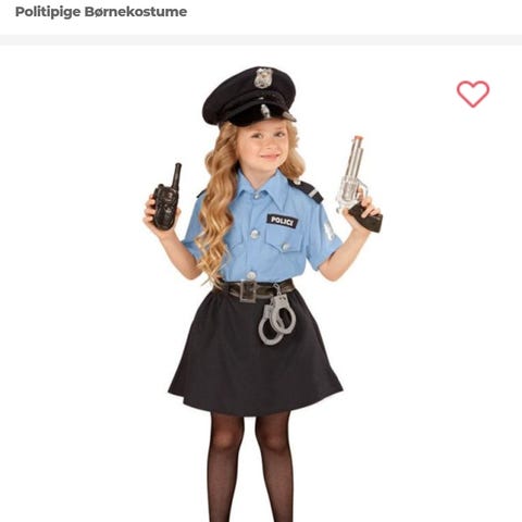 Dba skriver: Politi kostume bestående af mørkeblå kjole med korte ærmer, krave og knaplukning foran. Kjolen har påsyet politiskilt og dekorative lommedetaljer samt sort bælte i blankt materiale. Sættet inkluderer matchende mørkeblå kasket med skygge og metalemblem samt et sæt håndjern som tilbehør. Unisex kostume egnet til udklædning, fastelavn eller temafester.