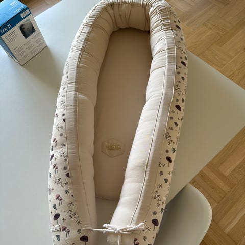 Filibabba babynest med fyld af kapok. Har været utroligt glad for den og været uundværlig i den første tid. Har nogle plamager, til trods for den altid har været brugt med stofble i. Ellers i fin stand.
