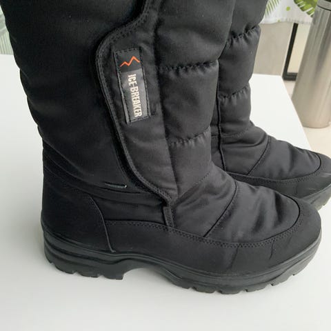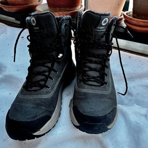 Støvlerne er højskaftede og i grå og sorte nuancer med røde snørebånd.