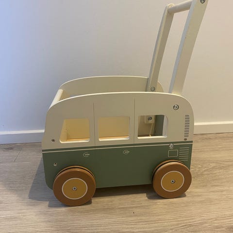 Little Dutch aktivitets gåvogn i træ med frontpanel med forskellige motorikaktiviteter. Vognen har blandt andet drejehjul, skydere, tandhjul, klodser og andre bevægelige elementer, der kan udforskes. Designet er i afdæmpede farver med dyremotiver. Egnet som støtte til de første skridt og som aktivitetslegetøj til små børn.
