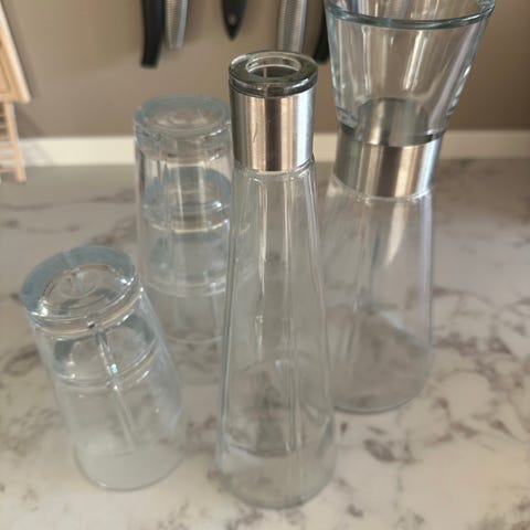 Rosendahl glas kande sæt bestående af to kander i klart glas med metalring og et mørkt låg til den ene kande. Egnet til servering af vand, saft eller andre kolde drikke i køkken eller på bordet. Enkel og funktionel udformning, der gør kanderne lette at hælde af og rengøre. Prisen er for begge 2.