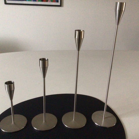 Bolia lysestager sæt i metal. Sættet består af tre slanke lysestager i børstet metal med rund fod og plads til almindelige kronelys. De tre stager har forskellige højder, hvilket giver et varieret udtryk, når de står samlet på fx spisebord, sofabord eller vindueskarm. Designet er enkelt og minimalistisk med glat overflade og neutral metalfarve, der passer ind i mange typer indretning.