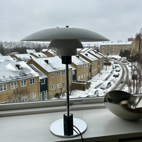 Louis Poulsen PH 3/4 bordlampe i hvidlakeret metal med kromfarvet stander.
