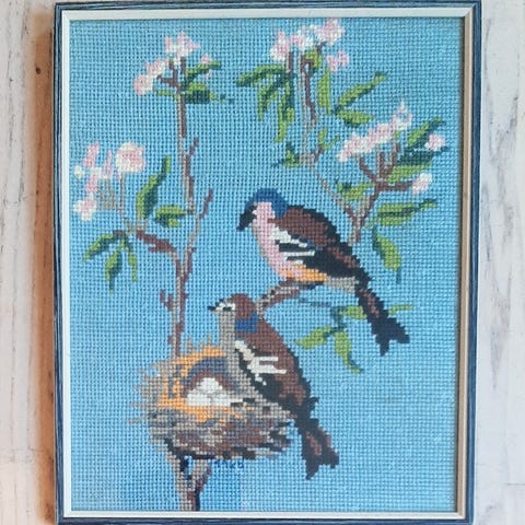 #vintage #retro #genbrug #secondhand #paentgammelt #fund #loppe #loppefund #broderi #fugl #billedvæg #kunsthåndværk #dekoration #interieur #indretning #boligindretning