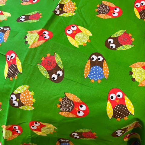 Smukt stof med fugle, blomster, sommerfugle mm i farverne grønne og blå toner med flere røde farver bordeaux, rosa og hvidt