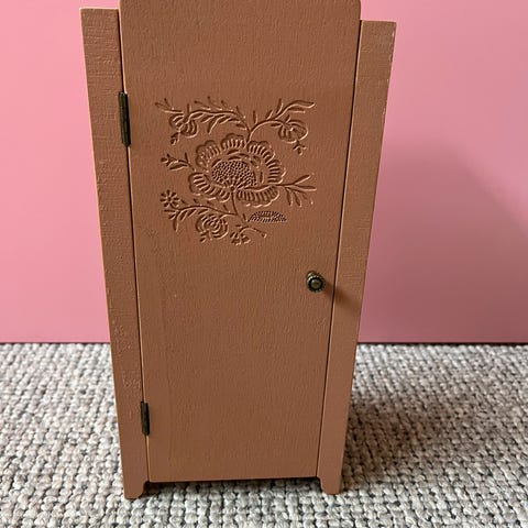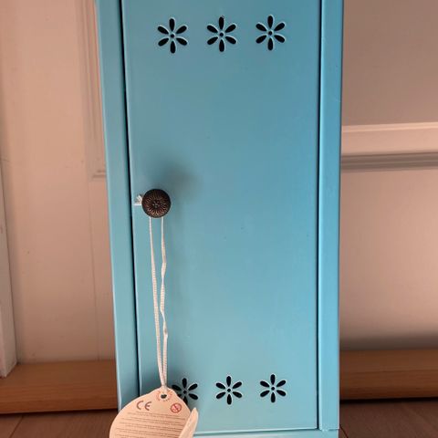 Maileg klædeskab til børn i træ. Skabet er malet i en lys mintgrøn farve og har en låge med lille blomstermotiv på ydersiden og spejl på indersiden. Indvendigt er der hylder i den ene side og bøjlestang i den anden side samt en skuffe nederst til opbevaring. Velegnet som legetøj eller opbevaringsmøbel på børneværelset.