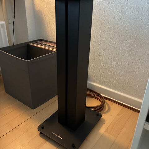 Bowers & Wilkins højtalerstandere i metal. Sættet består af to standere med rektangulære fodplader og topplader til placering af kompakte højtalere. Standerne er udført i metal med flere lodrette søjler, som giver stabil støtte til højtalerne. Velegnet til brug i stue eller lytterum, hvor højtalerne ønskes løftet fra gulvet for bedre placering.