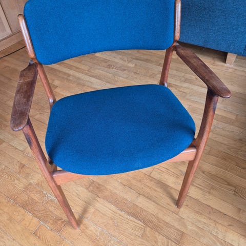 Erik Buch retro Dansk design armstol model OD 50. 1960 erne spisestuestol i teak sæder og ryggen polstret lyseblå uldstof pænt stand