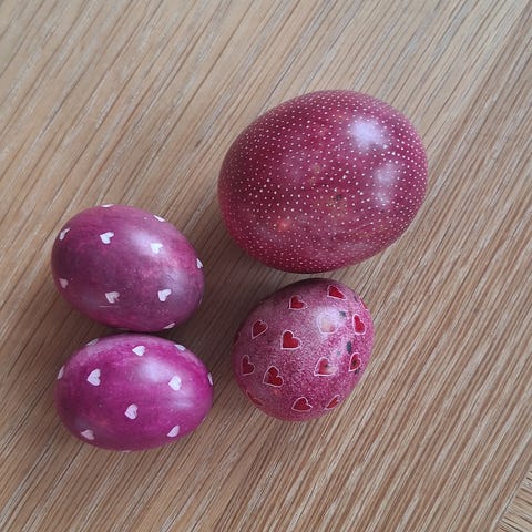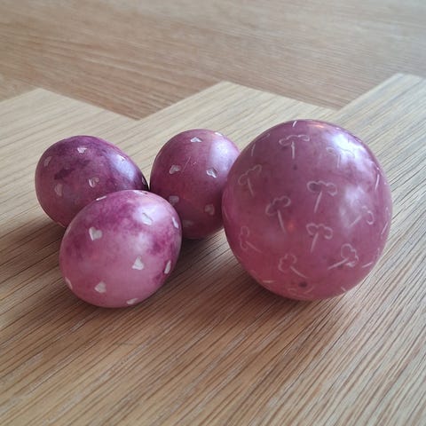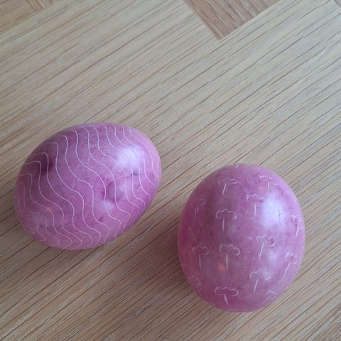 To smukke hånd dekorerede fedtstens æg, med fisk og sort/hvidt mønster.