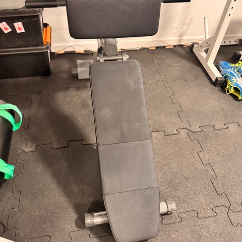 Bænken har polstret sæde og ryg i sort kunstlæder. Velegnet til generel styrketræning af overkrop og helkrop i hjemmegym.