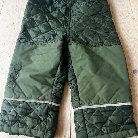 Mikkline termobukser i blå til dreng, str. 104. Gode, varme bukser med quiltet mønster på benene og har elastik i taljen. De er egnede som varme overtræksbukser til køligere vejr og kan bruges over almindelige bukser eller strømpebukser. God stand, fejler intet.