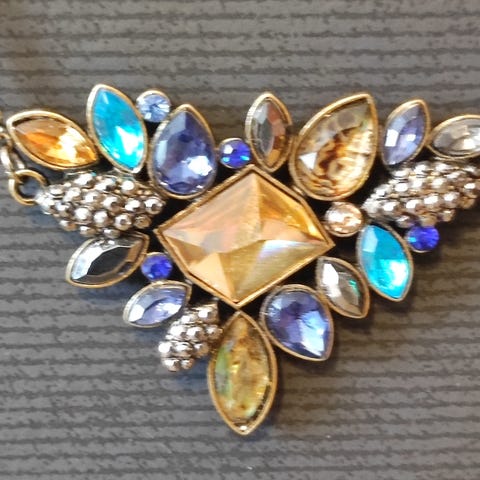 Smykkesæt til kvinde bestående af halskæde med vedhæng og matchende øreringe. Smykkerne er udført med krystal som hovedmateriale. Designet har organiske, blomsterlignende former i metal med indfattede klare krystaller. Sættet kan anvendes samlet eller hver del for sig til hverdag eller mere formelle anledninger.