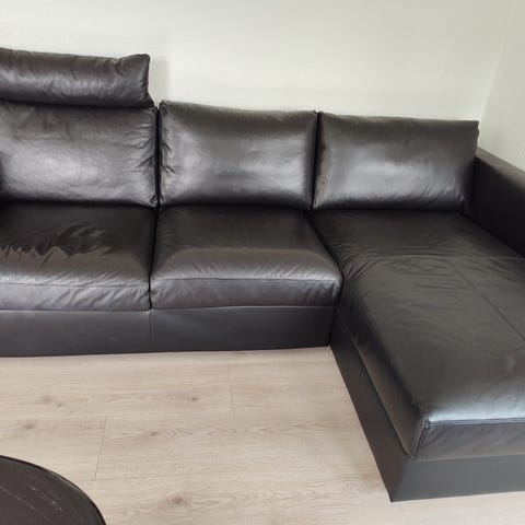 Ikeas Kivik sort lædersofa, 3-personers med chaiselong.