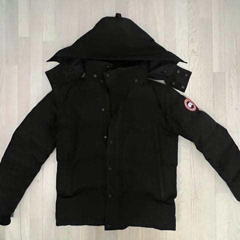 Canada Goose vinterjakke til herre i størrelse L. Jakken er sort og foret med dun. Den har hætte med aftagelig pelskant, gennemgående lynlås med vindstolpe, brystlommer og forlommer med klap. Klassisk Canada Goose-logo på brystet. Velegnet som varm vinterjakke i koldt vejr.