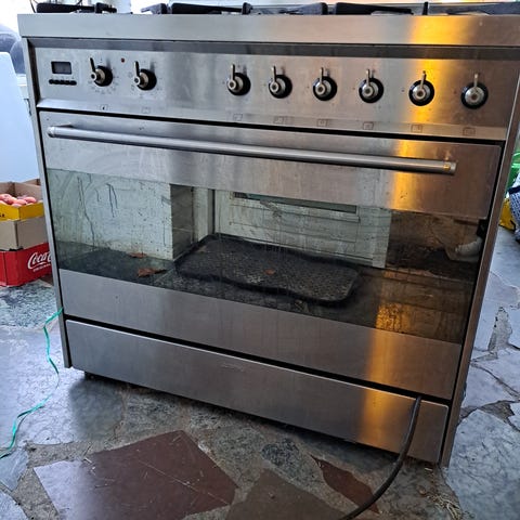 Smeg gaskomfur i rustfrit stål. Komfuret har gasblus på toppen og ovn med glaslåge. Fronten er udstyret med drejeknapper til regulering af blus og ovn samt display i midten. Velegnet til installation i køkken, hvor der er gasinstallation til rådighed.