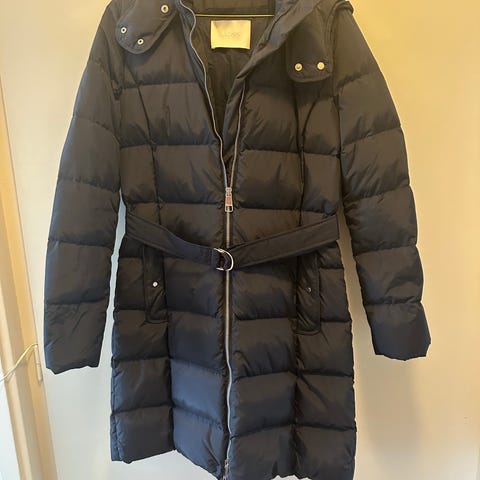 Hugo Boss grå vinterjakke str. 36-38. Super fin med dejlig høj krave med hætte bag lynlåsen. Meget små brugsspor på det ene ærme - derfor den lave pris (se billede). Skrå lommer samt lille inderlomme og lomme på venstre ærme ved Boss mærket. Lukkes med både lynlås og stykknapper og smart detalje med bælte spænde.Form-syet der fremhæver kroppens former.