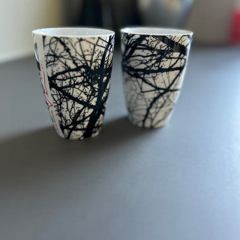 Porcelæn af Pernille Vea design Menu bestående af fem kaffekopper, fire skåle og et salt- og pebersæt. Delene er hvide med sort, buet linjemønster. Kopperne er velegnede til kaffe, te eller andre varme drikke, og skålene kan bruges til fx morgenmad, snacks eller tilbehør. Salt- og pebersættet er i samme design som resten af sættet. På en af kopperne ses en afskalning i kanten, som fremgår af billedet.