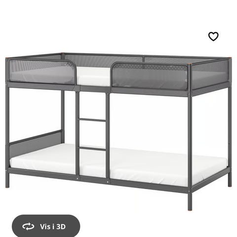 IKEA køjeseng i lyst fyrretræ med integreret stige i gavlen. Sengen består af to senge placeret over hinanden med sengeheste på øverste køje. Begge køjer er udstyret med madrasser i lys farve med stribet mønster. Trækonstruktionen er enkel og lige, velegnet til et værelse med træbeklædte vægge eller lignende indretning. Sengen er egnet til to sovepladser og kan anvendes i børneværelse, gæsteværelse eller sommerhus.
