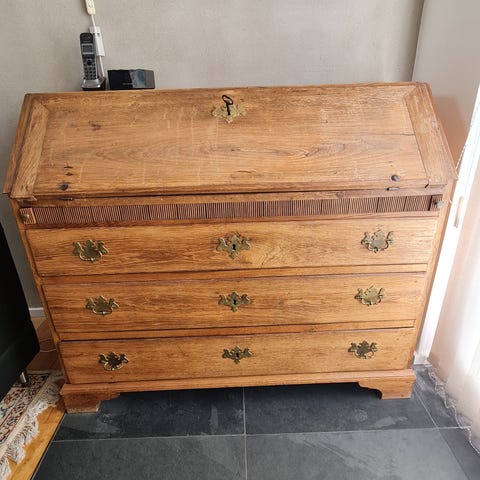Skrivekommode chatol i lyst træ. Møblet har klap ned-skriveplade og indvendig sektion med små skuffer og rum til opbevaring af papir og skriveredskaber. Udvendigt er der flere store skuffer med metalgreb og nøglehuller. Egnet som arbejdsplads eller opbevaringsmøbel i stue, kontor eller soveværelse.