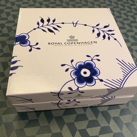 Royal Copenhagen lav skål i hvid porcelæn med blå dekoration. Tallerkenen/skålen har klassisk blomster- og rankemønster i blå på hvid bund. Aldrig brugt. Kun pakket ud fra at tage billede.