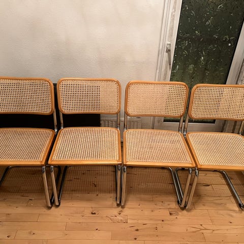 4 frisvinger hvide spisestole. Man sidder komfortabel. Læderet er i stykker ved ryglænet (se billeder)