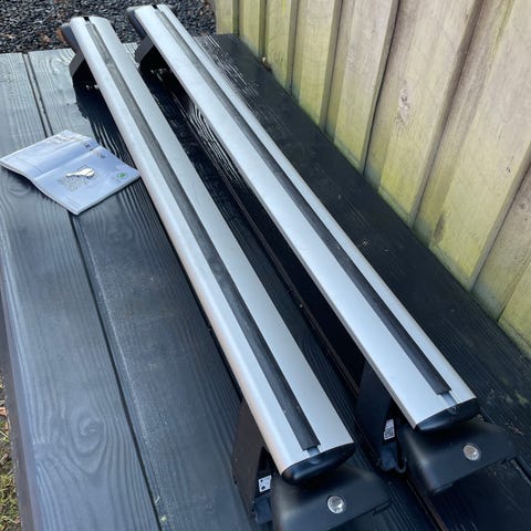 Škoda Octavia Combi NX5 tagbøjler (crossbar carrier) til montering på bilens tag. Originalt Škoda produkt med varenummer 5E7 071 151A. Sættet består af to tværgående tagbøjler, der monteres på bilens tagrails og kan bruges som grundlag for transport af fx tagboks, cykelholdere eller andet tagudstyr, der passer til standard tagbøjler. Farve i kombination af sølvfarvet skinne og sorte fødder.