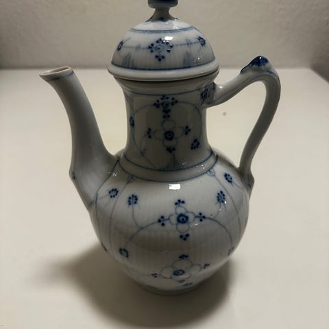 Blå-hvidt porcelæn stel med tekande, kopper og fade