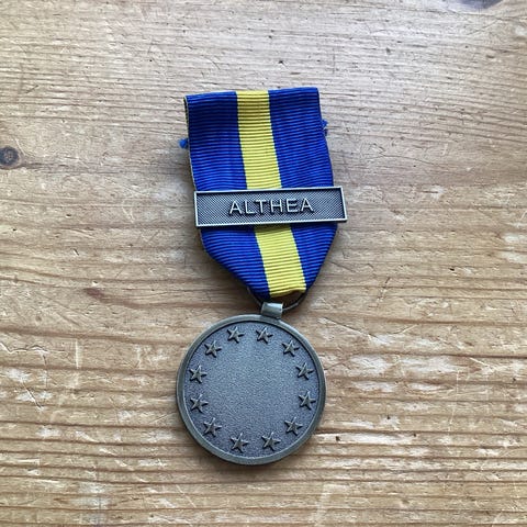 Medaljen er rund i bronzefarvet metal med præget motiv og teksten "De Blå Baretter 25 år FN NATO OSCE EU" på forsiden.
