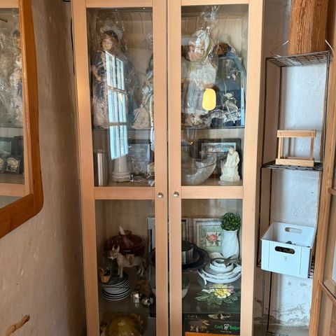 Vetrineskab er bejset i hvid. Længde 247 cm. Højde 200 cm. Dybde 54