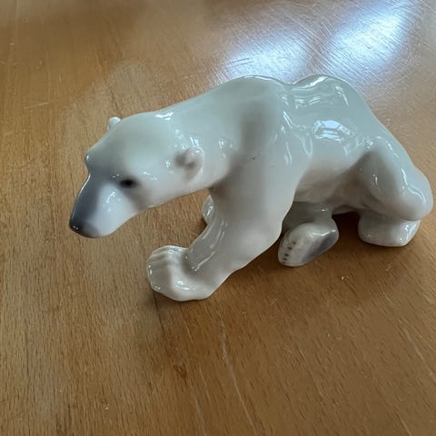 Bing & Grøndahl porcelænsfigur forestillende en liggende isbjørneunge. Figuren er udført i hvidglaseret porcelæn med lysegrå og lysebrune detaljer på poter og snude. Undersiden er mærket med Bing & Grøndahl stempel samt modelnummer 2538. Velegnet som dekoration i stue, vitrineskab eller som del af en samling af dyrefigurer i porcelæn.