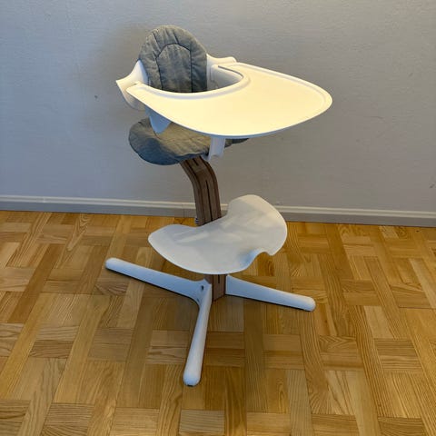 Nomi højstol fra Stokke i hvid/bøg med blå/hvidstribet hyndesæt.