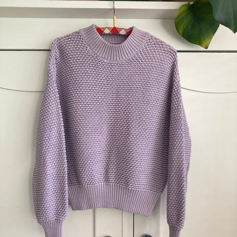 Mango sweater til kvinder i størrelse L. Strikken er hvid med mørke vandrette striber forneden og på ærmerne samt strukturstrik på kroppen. Materialet er 100 % bomuld. Sweateren har rund hals og ribkanter ved hals, ærmer og bund. Velegnet til hverdagsbrug og lag-på-lag outfits.
