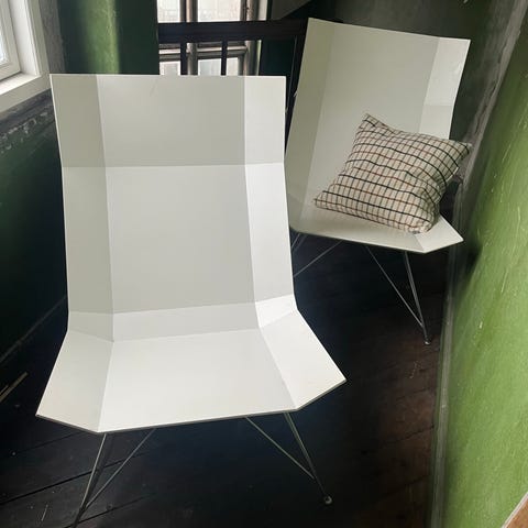 Fede Bolia Edge stole. 2 stk haves. Oplagt til at sætte sit eget præg. Mal en fed farve - eller måske brug dem så “lærred” til at male et brugbart kunstværk til stuen. Eller sy nogle fede hynder eller brug med med et lammeskind.