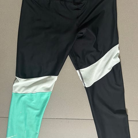 Nike træningstøj til fitness pige/kvindeni størrelse S. Pakken består af flere par sorte træningstights/leggings samt en kortærmet blå trænings-T-shirt, alle med Nike-logo.