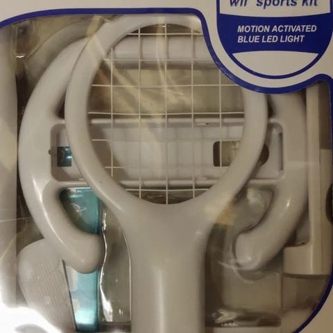 Wii Sports Kit 15-i-1 gaming tilbehør i hvid. Sættet indeholder forskellige plastadaptere og holdere til Wii-fjernbetjening, udformet som blandt andet ketcher, rat, pistolgreb og andre sportsrelaterede redskaber. Tilbehøret er beregnet til brug med sports- og bevægelsesspil på Wii-konsollen og giver mulighed for forskellige greb og former, der passer til de enkelte spiltyper.