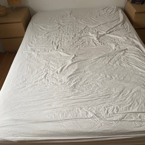 IKEA seng med grå madras. Sengen står på ben og har en enkel, neutral grå overflade, der passer ind i de fleste soveværelser. Velegnet som seng i soveværelse, gæsteværelse eller ungdomsværelse.
