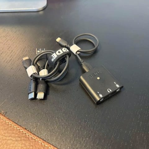 Røde SC6 mobil audiointerface i sort. En kompakt adapter til lydoptagelse, der giver mulighed for tilslutning af op til to TRRS-mikrofoner og hovedtelefoner til kompatible mobile enheder. Velegnet til interview, podcast og anden mobil lydoptagelse, hvor der er behov for flere mikrofonindgange og monitorering via hovedtelefoner.