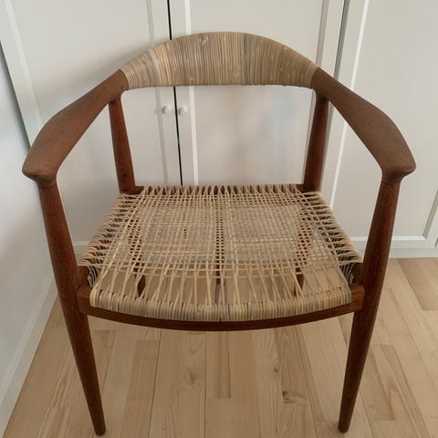 Carl Hansen stol designet af Hans J. Wegner. Spisestuestol med træstel og flettet sæde. Stolen har karakteristisk buet ryg og armlæn samt krydsflet i sædet. Velegnet som spisebordsstol eller enkeltstående stol i stue, køkken eller kontor.