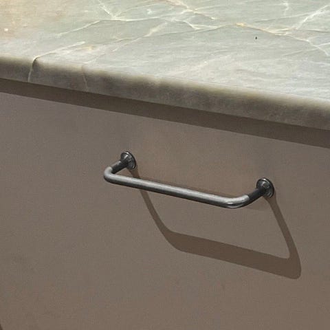 Egoki greb til skab eller skuffe i metal. Buet design med to monteringspunkter og medfølgende skruer. Egnet til montering på køkkenskabe, badeværelsesskabe eller andre skabe og skuffer, hvor der ønskes et enkelt, moderne udtryk.