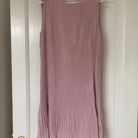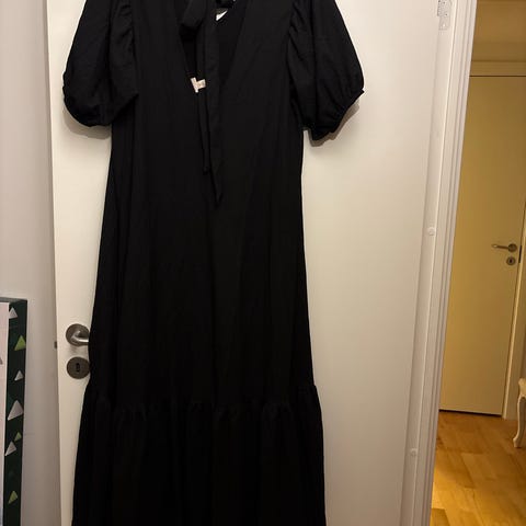 H&M hverdagskjole i størrelse 36. Lang kjole i sort polyester med blomstermønster og lange ærmer. Kjolen har v-udskæring og let, gennemsigtigt yderlag med underkjole. Egnet som hverdagskjole til dame.