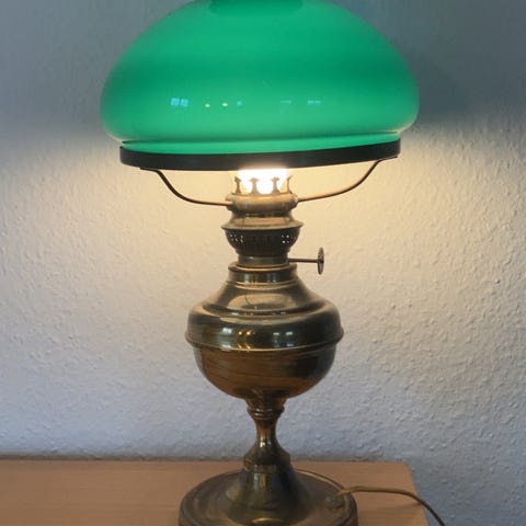 Klassisk petroleumslampe i messing med en grøn glasskærm, der er blevet omdannet til en elektrisk bordlampe.